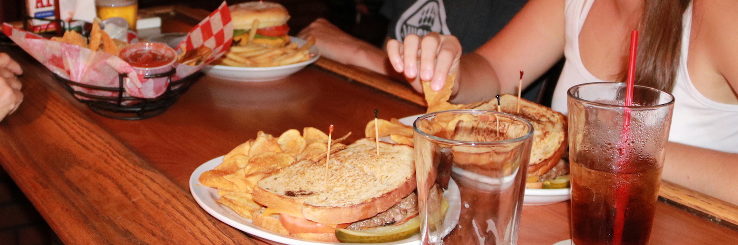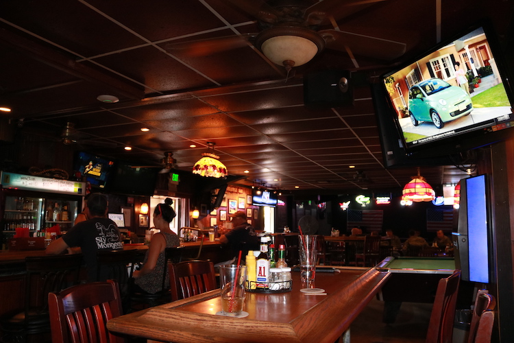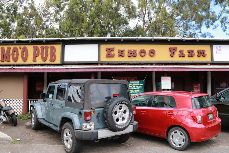 Stop déjeuner improbable, à la vue de l'apparence extérieure du restaurant, entourés de G.I. au Stop au Kemo'o Farms Pub and Grill, entre Laniakea beach et le Bishop Museum.