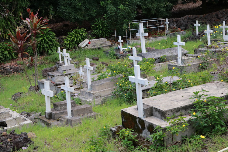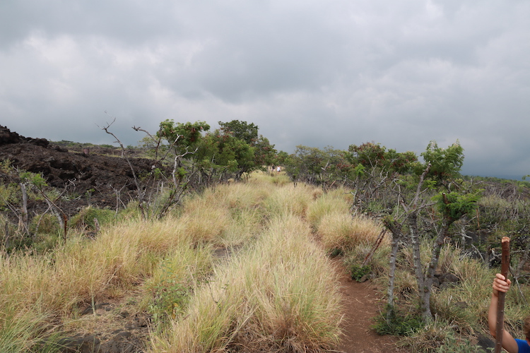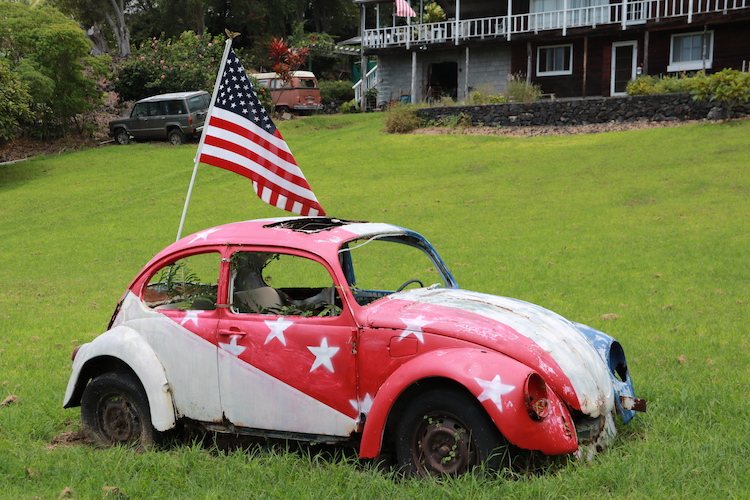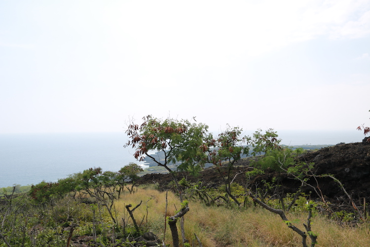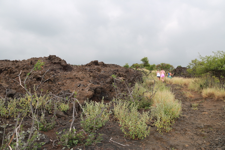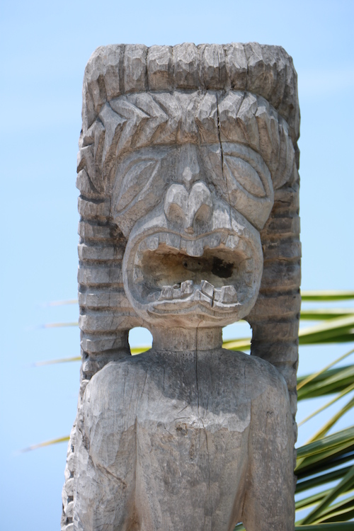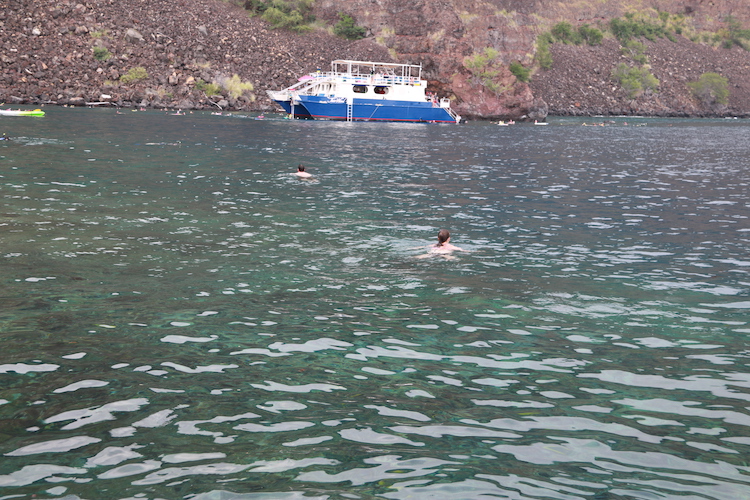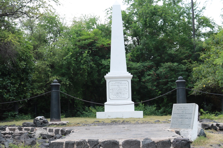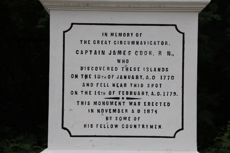 Comme d'autres, nous nous sommes garés le long de la route à côté du départ du Trail. Ce trail, d'une heure environ, est en grande partie au milieu d'une végétation très haute. Si c'était à refaire, nous louerions des canoës de l'autre côté de la baie pour rejoindre le Captain Cook Monument. Contents de plonger dans l'eau arrivés au monument !