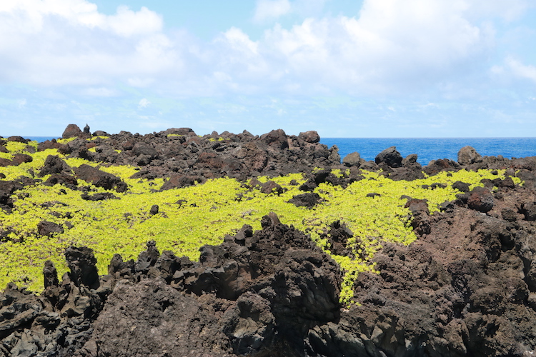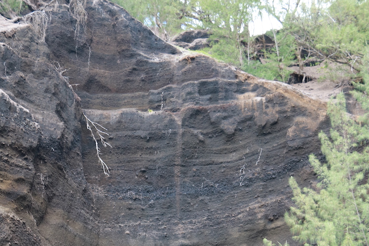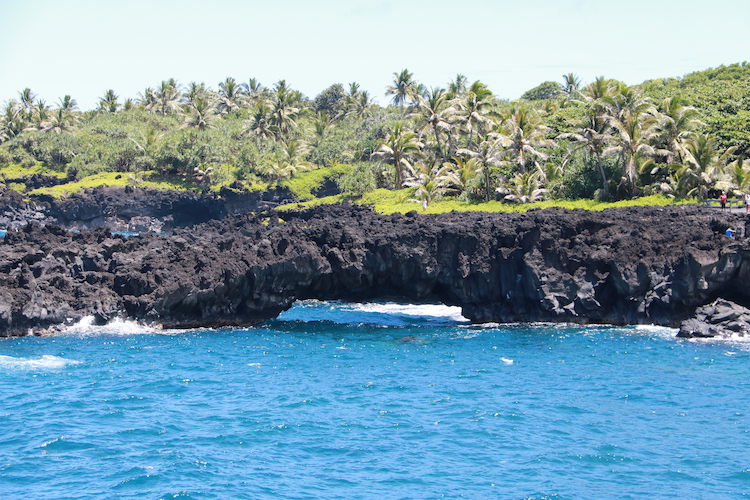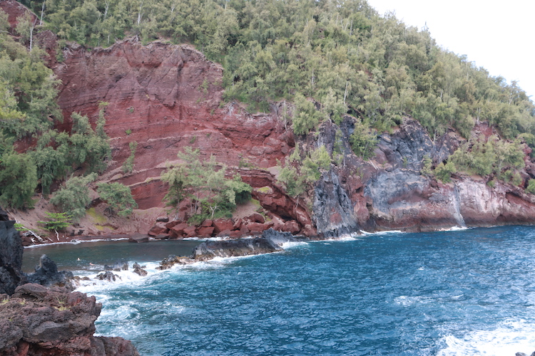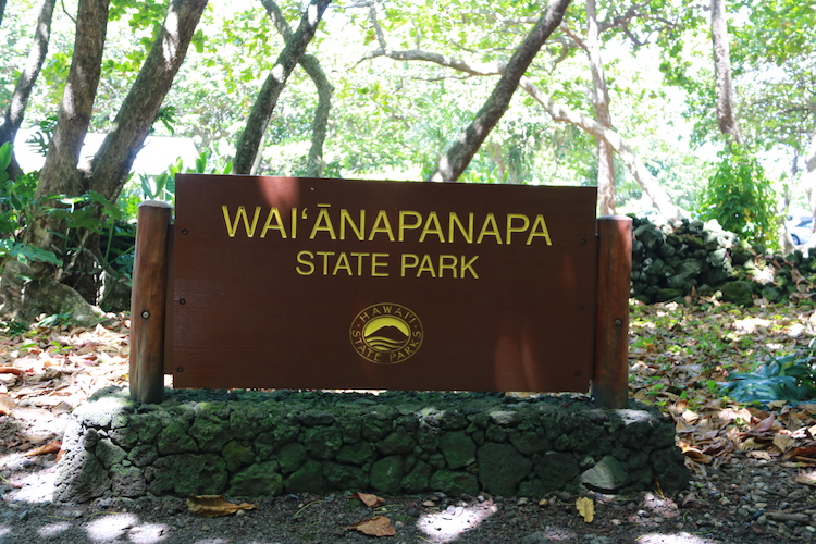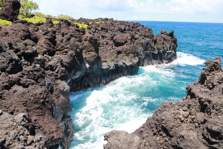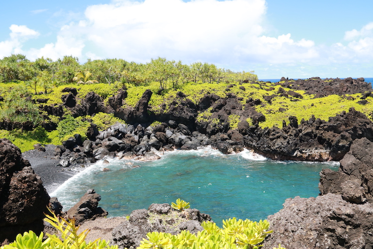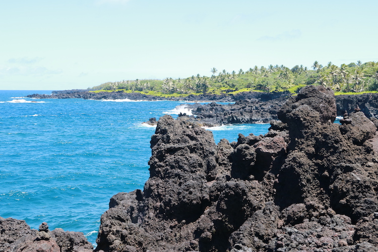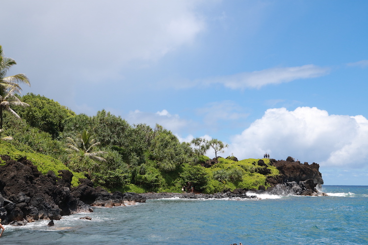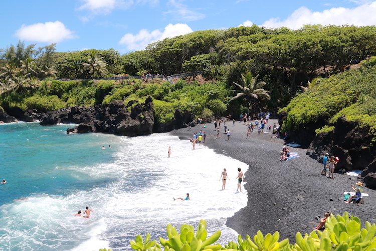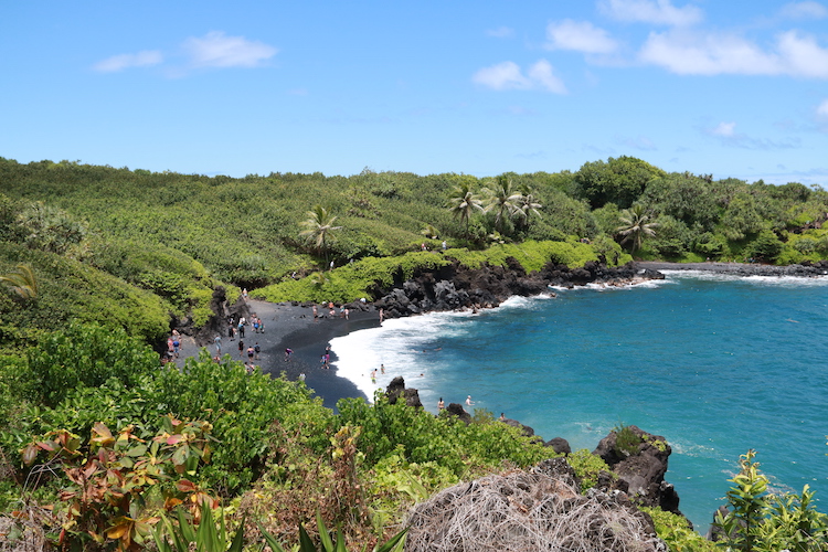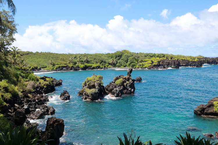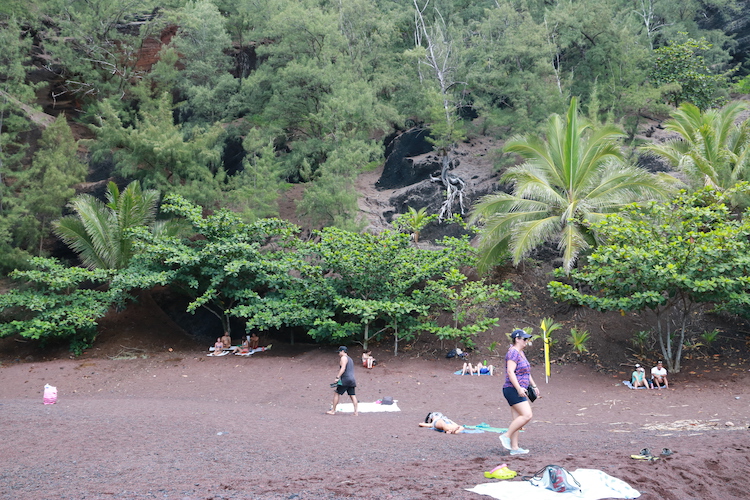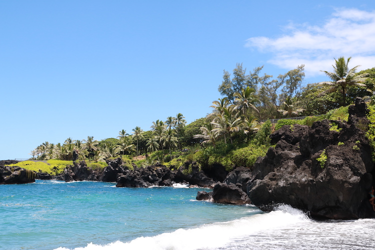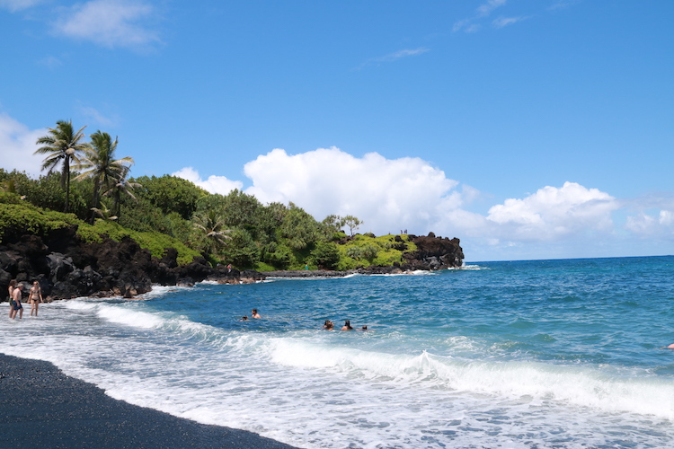 Nous avons pique-niqué dans le parc Waianapanapa avant d'emprunter de petits escaliers pour cette belle plage de sable noire.