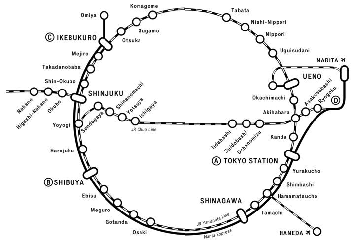 Arrivés à "Tokyo Station", nous prenons la ligne de métro "Yamanote" (incluse dans le JR Pass) en direction du quartier de Shinjuku où se trouve notre logement. Cette ligne fait une boucle dans Tokyo et permet d'accéder aux principaux quartiers :
