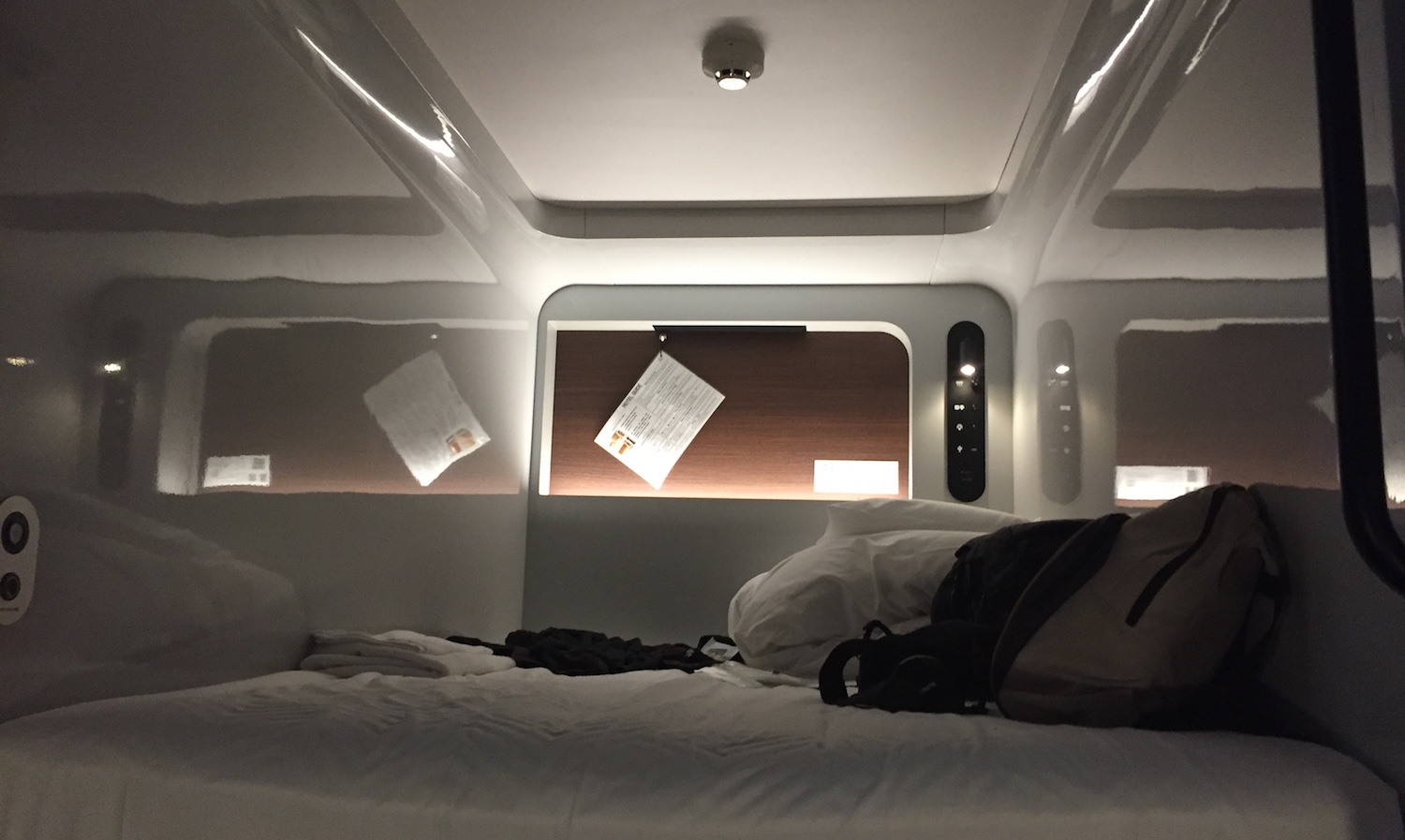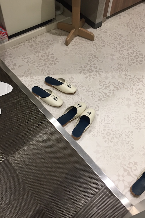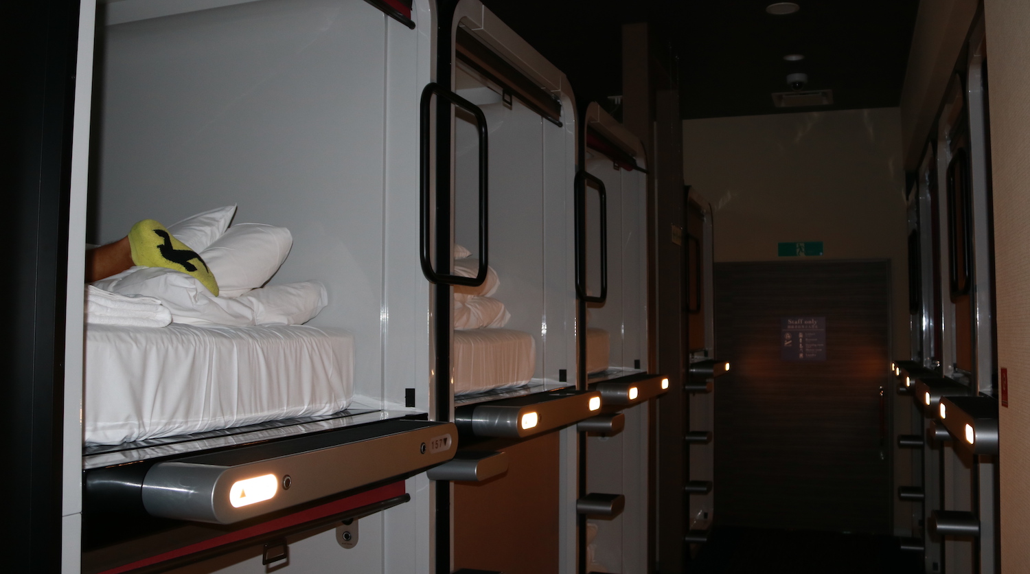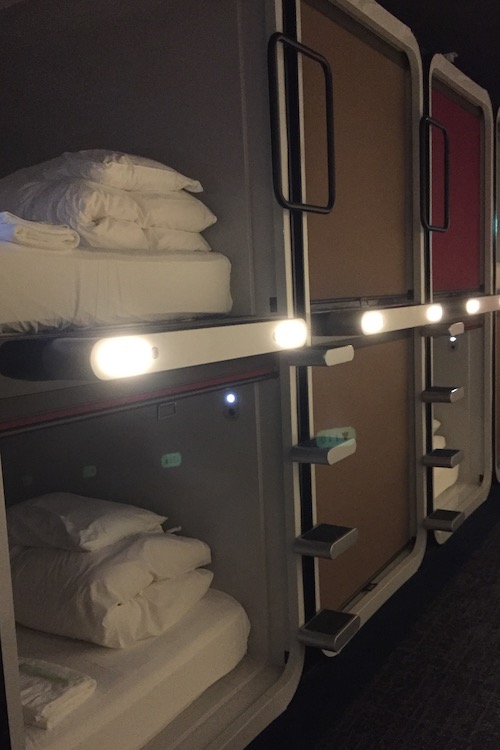 A quelques pas de la gare de "Fujikyu Highland", découverte de notre hôtel "Capsule", Cabin & Lounge Highland Station Inn. On nous demande tout d'abord de quitter nos chaussures en entrant dans le hall de l'hôtel; puis, après le check-in, on récupère tous les affaires de toilettes dont le pyjama. Les douches et sanitaires sont communs mais tout est très propre. On dispose même de pantoufles spécifiques pour l'accès dans la zone des WC. Même claustrophobe, on y passe une bonne nuit !