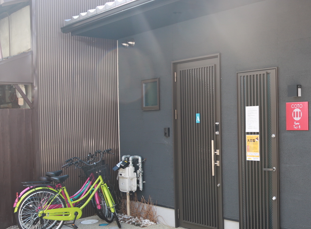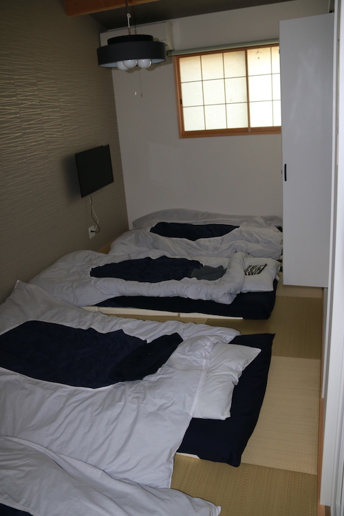 Arrivés à Kyoto, le propriétaire de la maison (Coto Kyoto Toji 6) est venu nous chercher à la gare. Nous sommes logés dans une petite rue tranquille à 15 minutes à pied (4 arrêts de bus) de la gare de Kyoto. Cette petite maison a été toute refaite avec des équipements modernes mais les lits restent des matelas d'une dizaine de centimètres posés au sol.