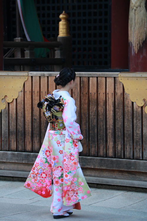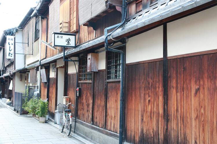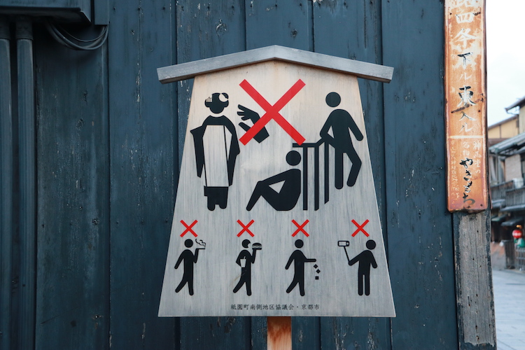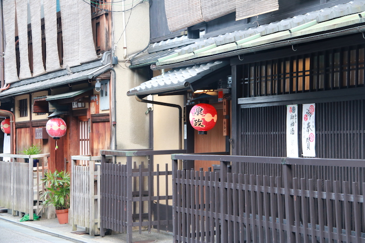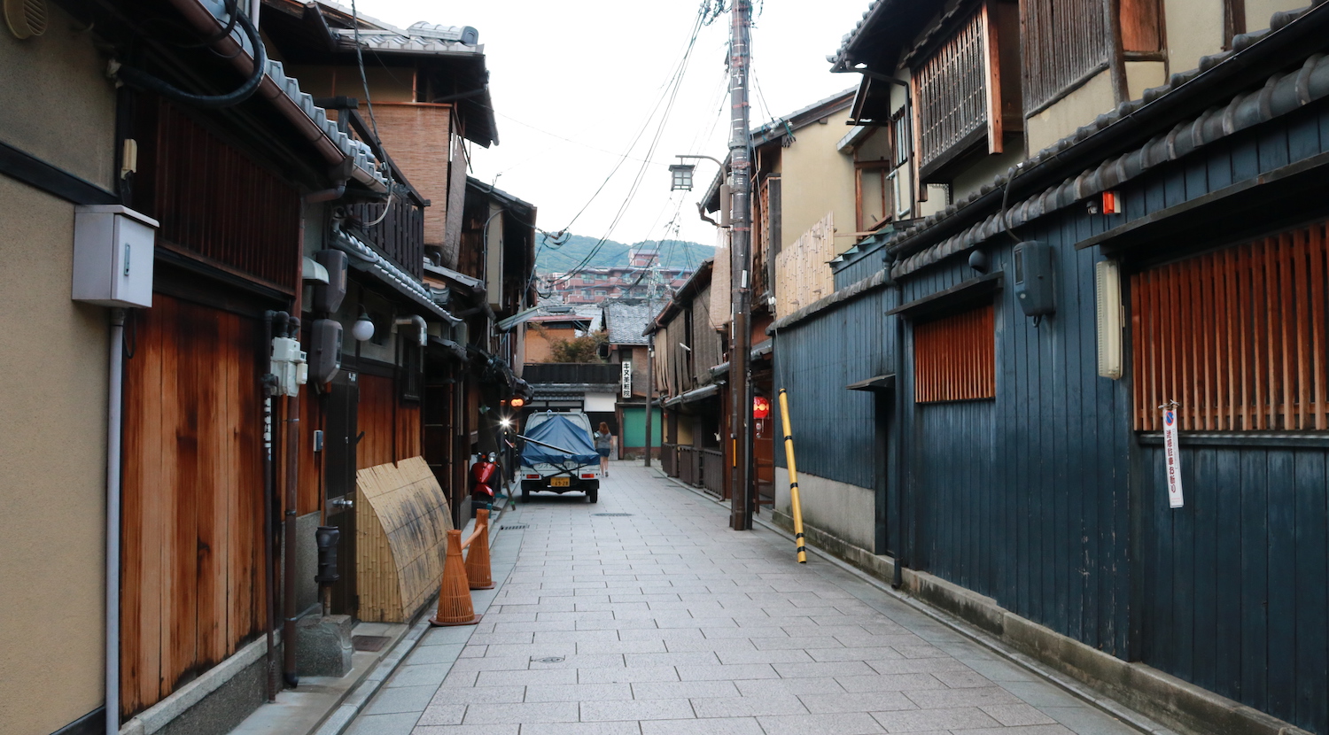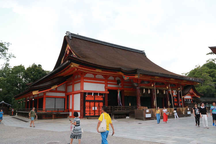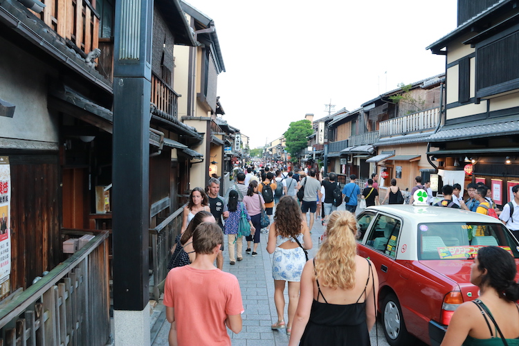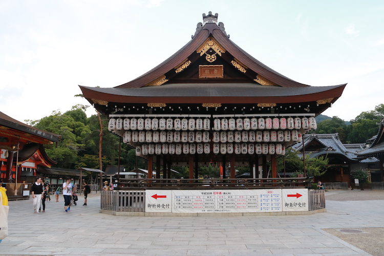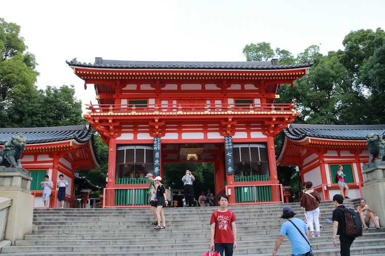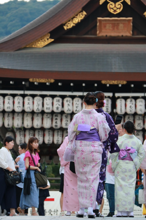Nous terminons les visites de la journée par le quartier de Gion, le quartier des Geishas. Il est interdit de les photographier mais il est surtout difficile d'en apercevoir ... celles qu'on peut voir sont principalement des touristes chinoises qui revêtissent la tenue des Geishas. On commence par le sanctuaire "Yasaka-jinja", puis ensuite le quartier historique.