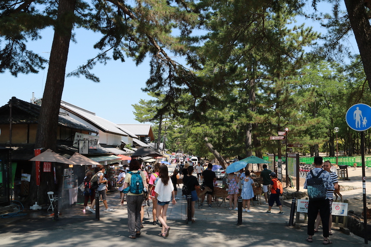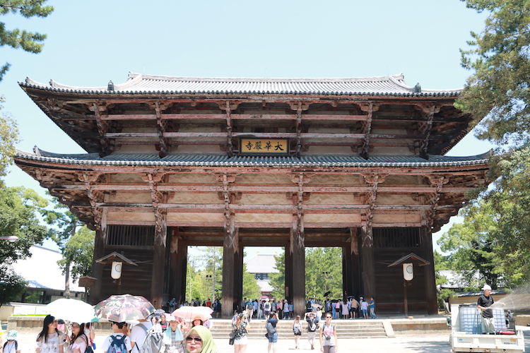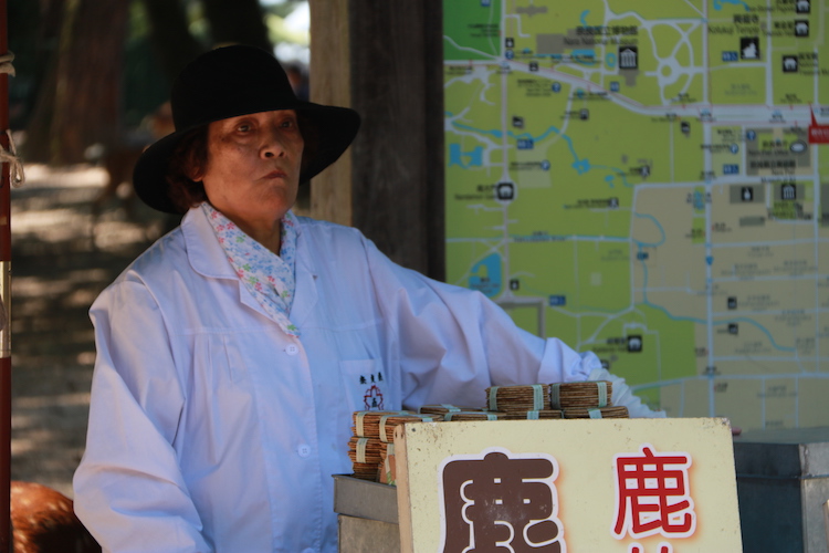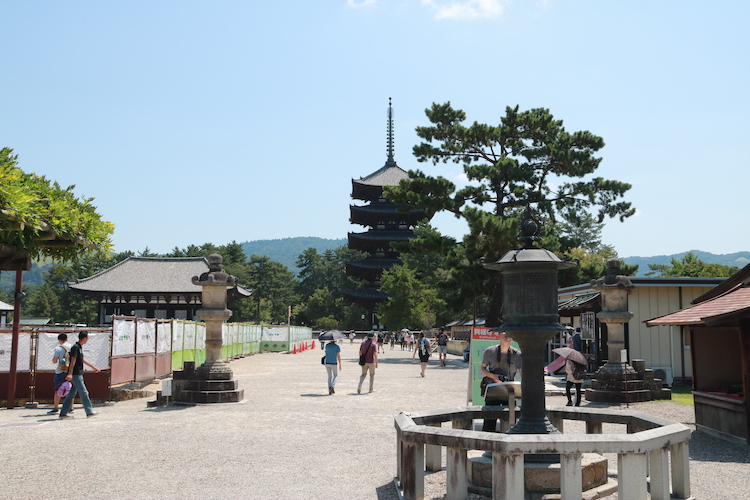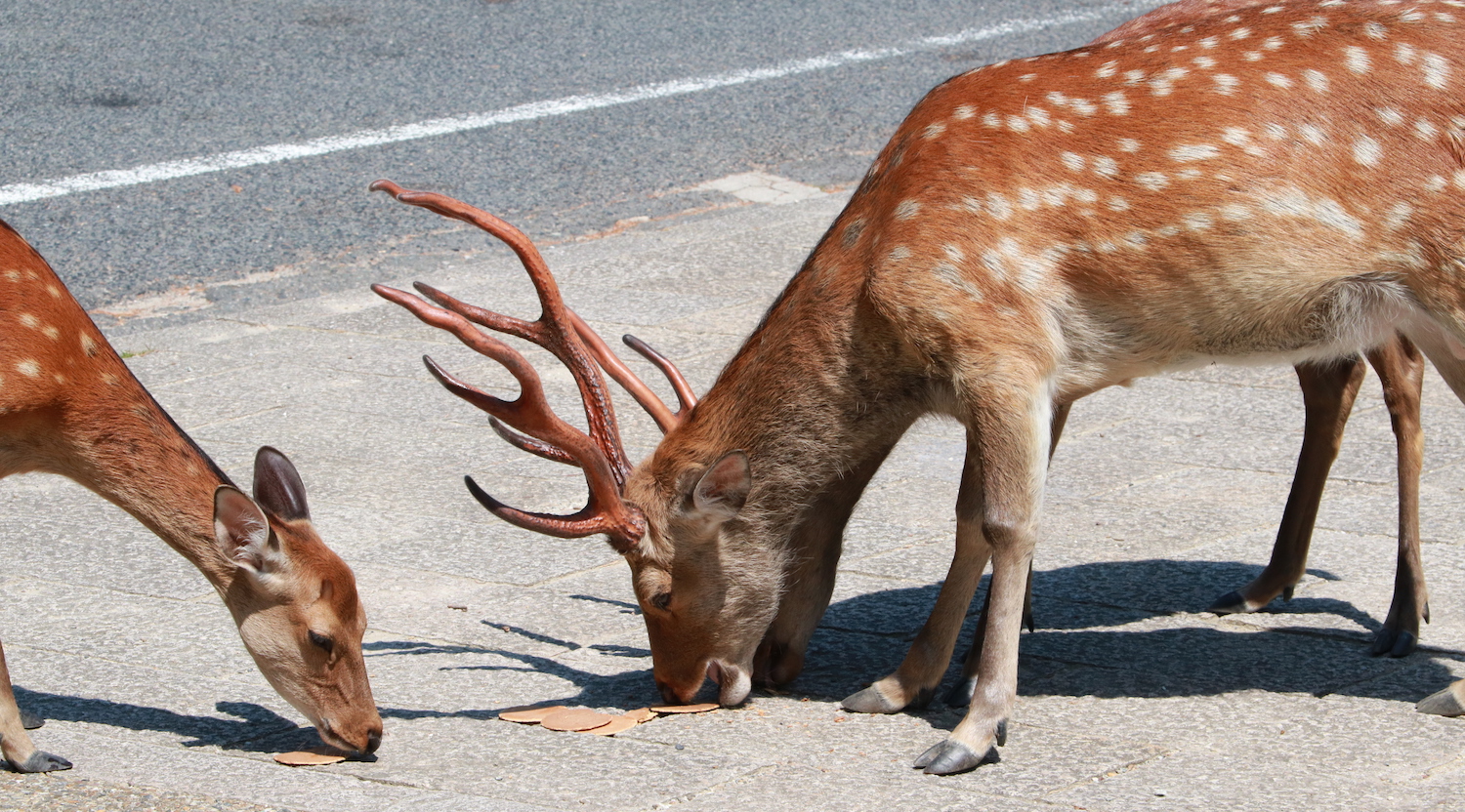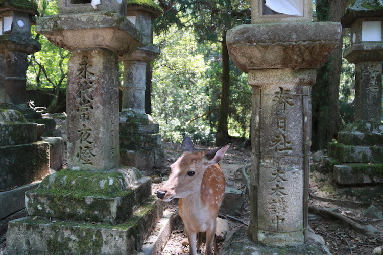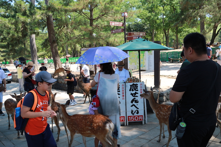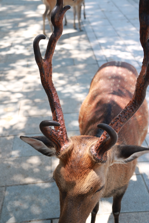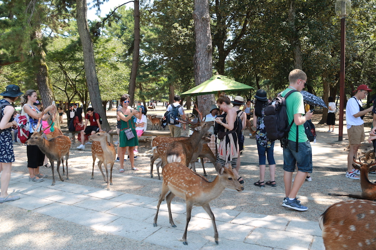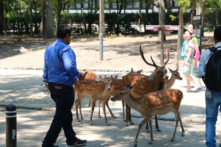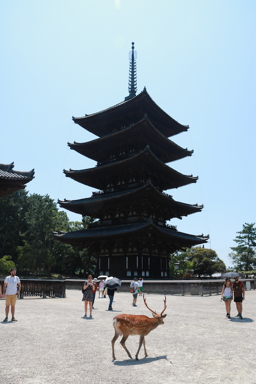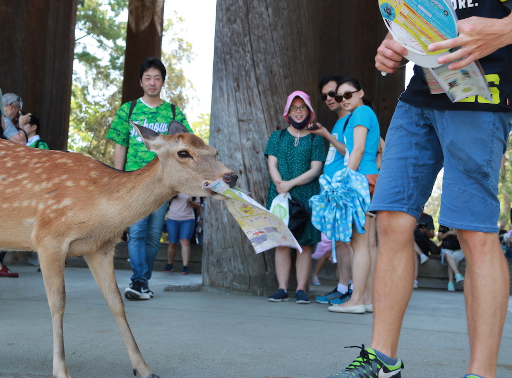Depuis la gare de Nara, une ligne de bus permet d'accéder à l'ensemble des sites à visiter. Nous optons pour : "Kōfuku-ji", "Tōdai-ji" et "Mizuya Shrine". Une fois à pied, nous nous retrouvons au milieu des daims qui nous réclament des biscuits que nous pouvons acheter auprès des différents vendeurs ambulants.