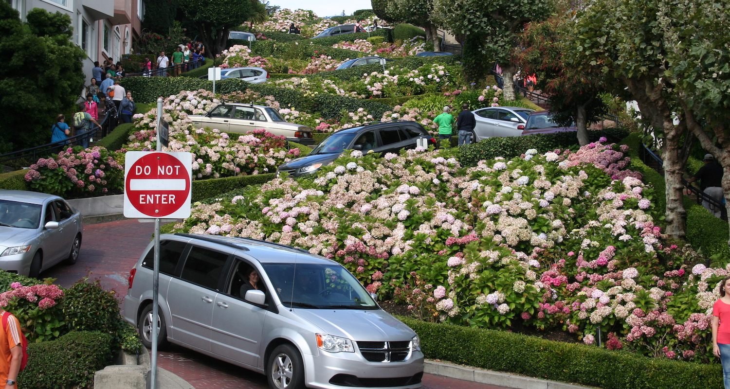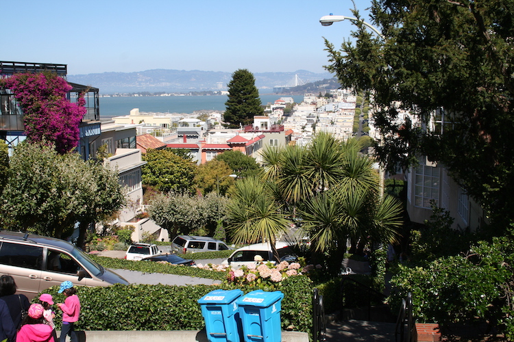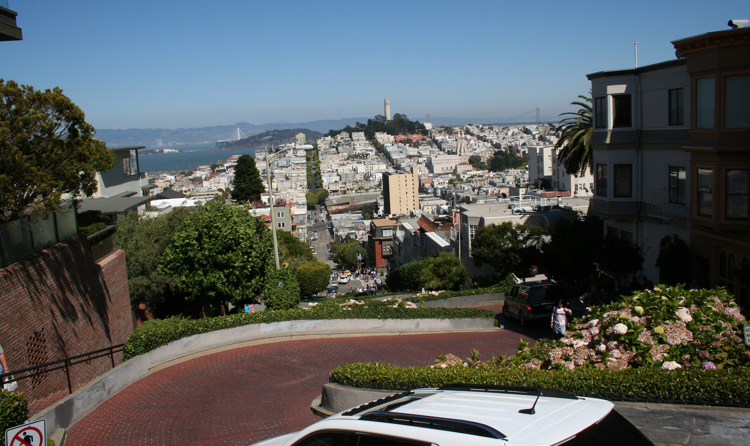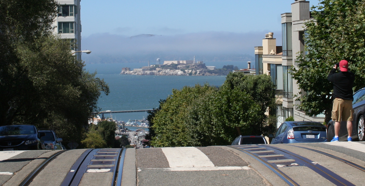 ... direction ensuite l'intersection entre "Lombard Street" et "Hyde Street", avec une vue sur "Alcatraz" d'un côté, la "Coit tower" de l'autre et bien sûr les S de "Lombard Street" (bien bouchée) ...